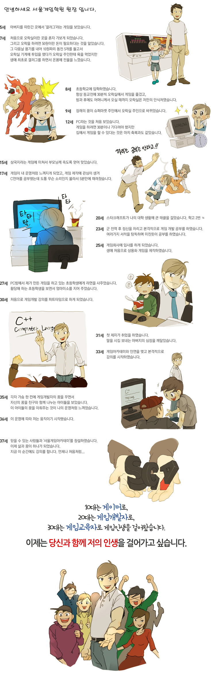 - 37세 믿을 수 있는 사람들과 '서울게임아카데미'를 창설하였습니다. 이제 삶과 꿈이 하나가 되었습니다. 지금 이 순간에도 강의를 합니다. 언제나 처음처럼...